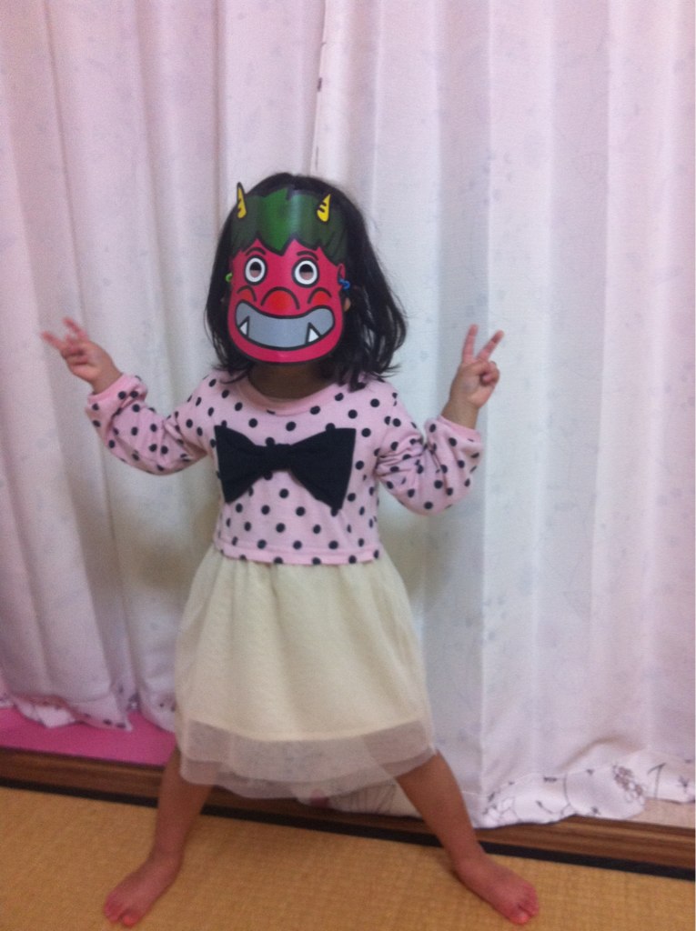 節分の夜に現れた凶悪なモンスターです!赤鬼♀三歳です。たまにオネショしたりお片づけしなかったりと被害は甚大です。凶暴なのでみかけたらご一報を!